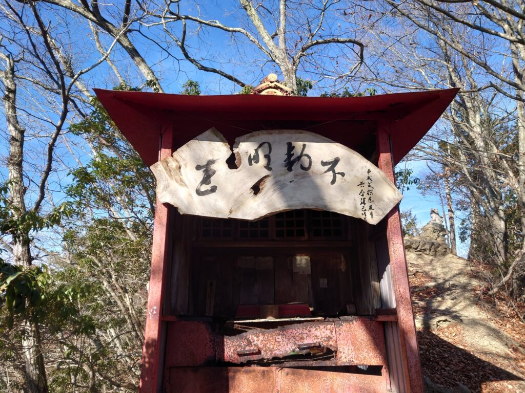 慎重に下山していきます。狛犬の数メートル下に錆びた社があります。看板にはたぶん「不動明王」と読むで合っているかな。現在は安置されておりません。祈りを捧げにここまで登ってきた人を守っていたのでしょうね。「動かざる明王」、最強の守護神です。