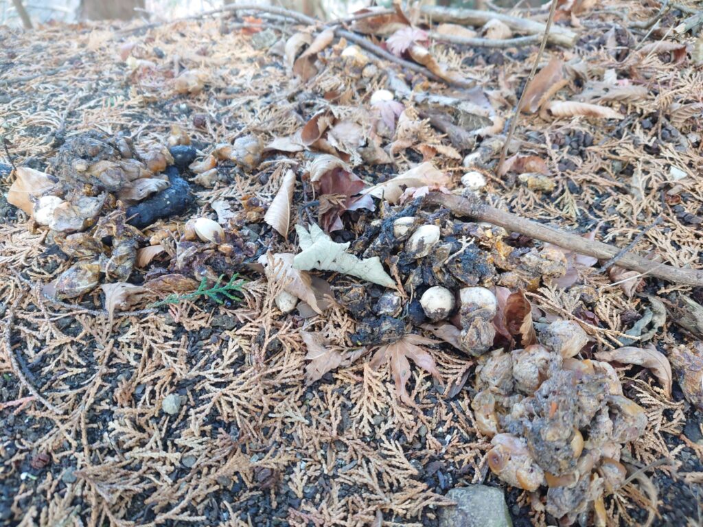 鹿の糞を発見しました。まだ新しく、銀杏を殻のまま食べて消化できなかった様子。この先も慎重に進みます。