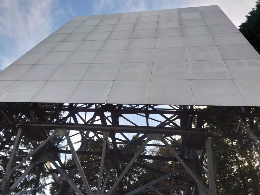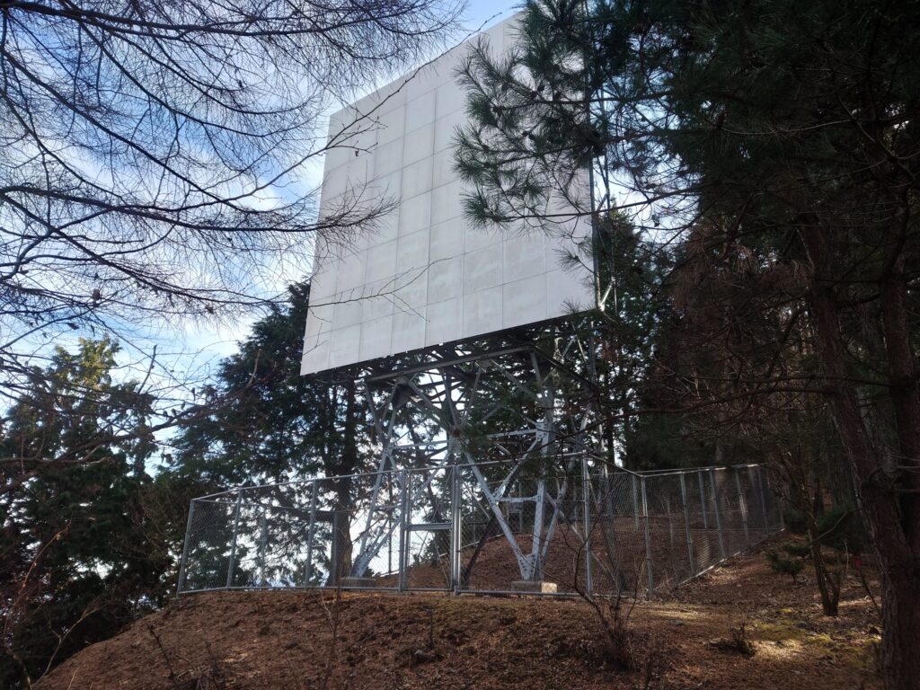 調べました。この反射板、直進性の強い電波の性質を利用して、電気などのエネルギーや長距離ケーブルなどを使わずにダムに電波を飛ばすエコロジーな施設だそうです。いくつもの山の向こうにあるダムと通信するための貴重な施設で、「ナニコレ珍百景」でも紹介されたユニークな存在です。