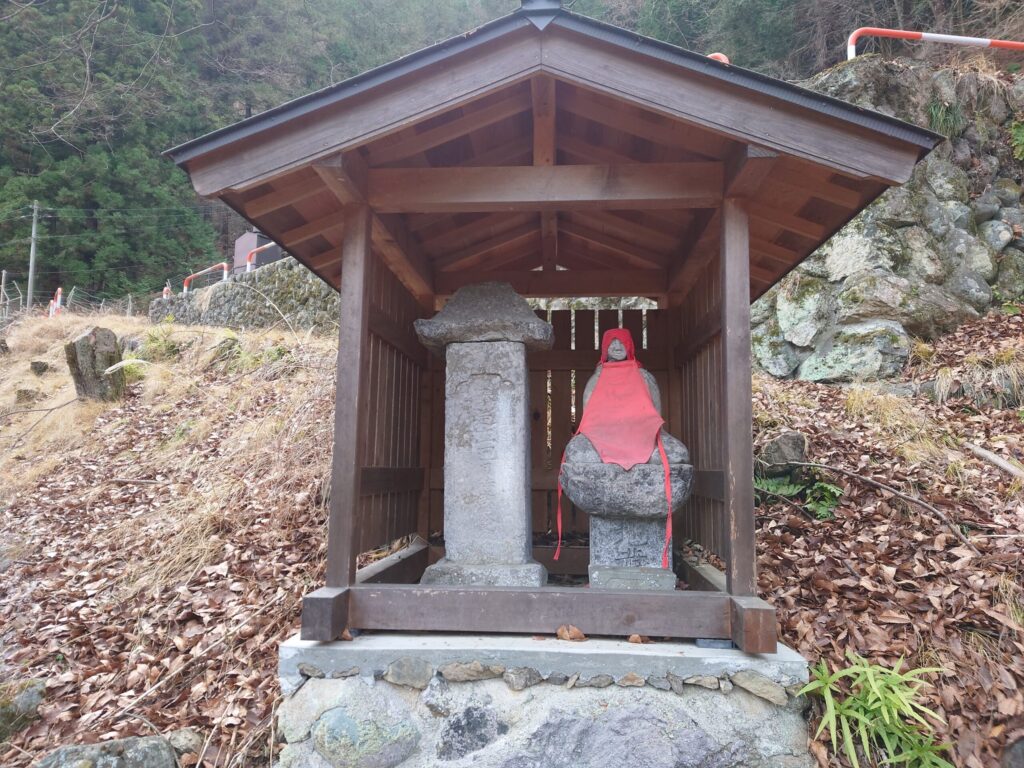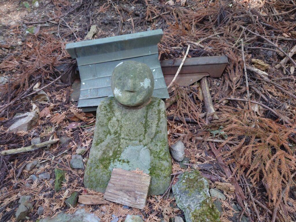 杉ノ峠まできました。お地蔵さんです。祠が壊れてしまっています。表情は穏やかそうに見えます。右手に錫杖を持っています。仏師ではなく、近くの集落に住んでいた民衆が彫ったような雰囲気を感じます。温かみがあります。
