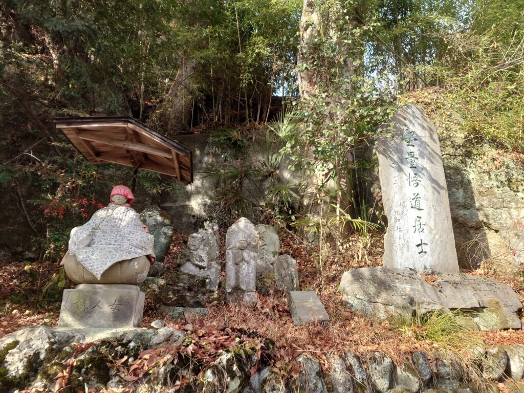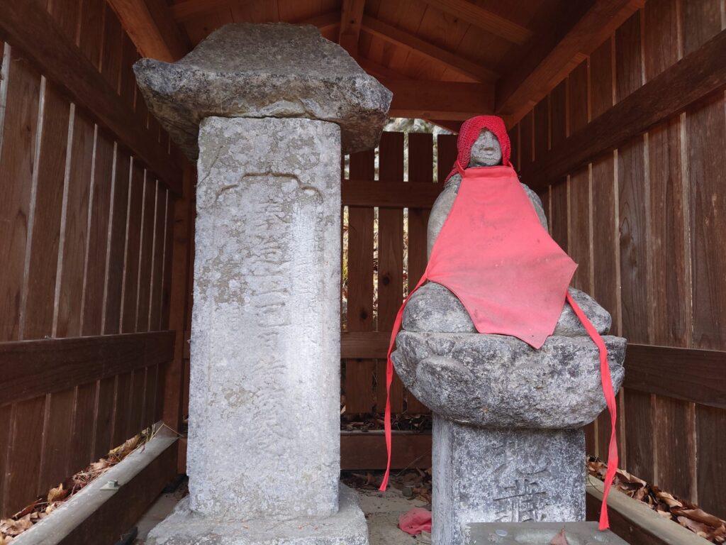 天気も良くてくてく歩いていると、お地蔵さんです。しっかり祠の中に安置されていて、大切にされていることが感じます。このお地蔵さんは蓮華座の上に座っています。赤い頭巾に前垂れ。赤は魔除けや清浄を意味する色で、とても良く似合います。左の笠の着いた石塔は「奉造」とあります。心を込めて彫ったものでしょう。