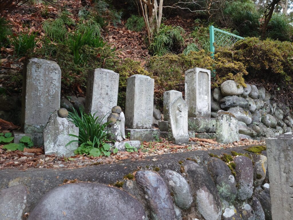 お地蔵さんです。赤い帽子に前掛けです。台座に女人講とあります。女性だけで組織された信仰的な集まりがあった地域と伺えます。前掛けは子供を意味するので、安産や子育て、供養などの親睦があったのでしょう。奥に石幢があり右には石碑です。居士とあるので戒名でしょうね。供養碑と思われます。