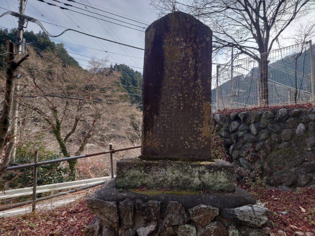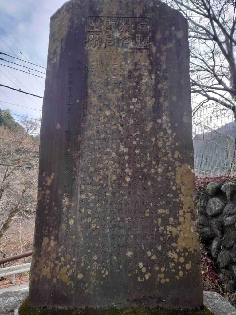 強石を歩いていると大きな石碑です。近くで見ると漢文がびっしり。秩父、道路、拓殖、驚異、魔術、不撓不屈などなどが書かれています。功績を称えるものと推察されます。