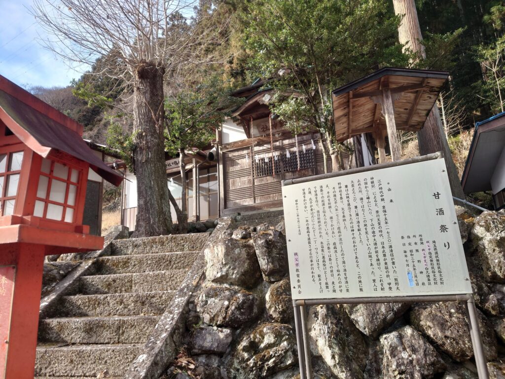 階段を登ってきました。かつて疫病が流行った時、人々がそれを鎮めるため、熊野大神の霊験にすがり、お酒を供えて祈願したところ疫病が収まったことが起源だそうです。その後また疫病が流行し、このときは甘酒に変えてお供えし、裸で水を被る厄除け行事を行いました。これが甘酒祭りの由来だそうです。甘酒祭りは毎年7月に行われる伝統行事で、埼玉県選択無形民俗文化財になっています。動画にあるのですが、境内の隅にコンクリート製のプールのようなものがあります。これは甘酒を薄めてかけるための水であったり、甘酒を被った身体を水で清めるための貯水に使用しているものと思われます。