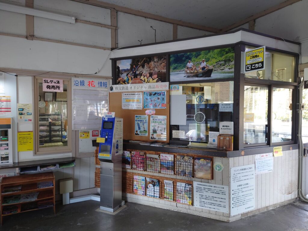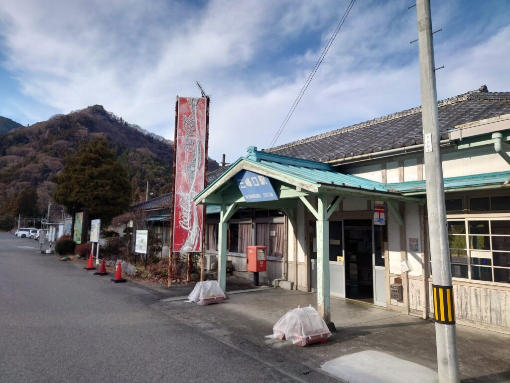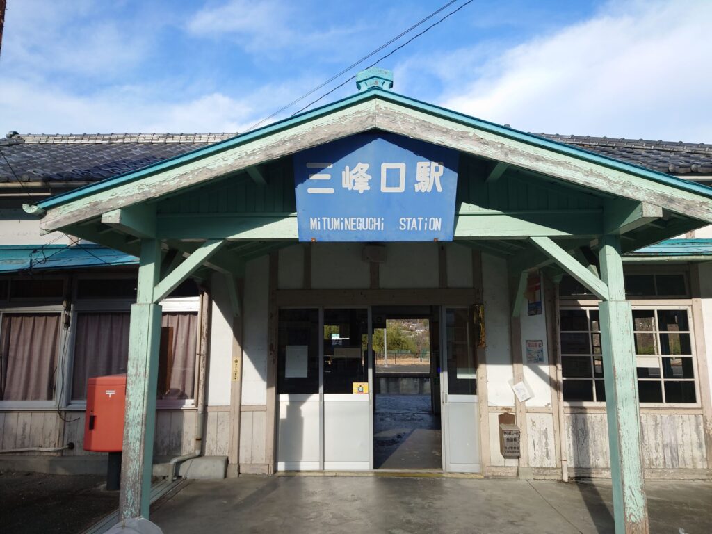 到着しました。三峰口駅です。三峰神社が神域であるならここはその玄関。ミントグリーンが神域の玄関にふさわしい清廉な空気感を醸し出しています。瓦葺屋根平屋で下見板張りの駅舎に切妻屋根のファサード、堂々としています。