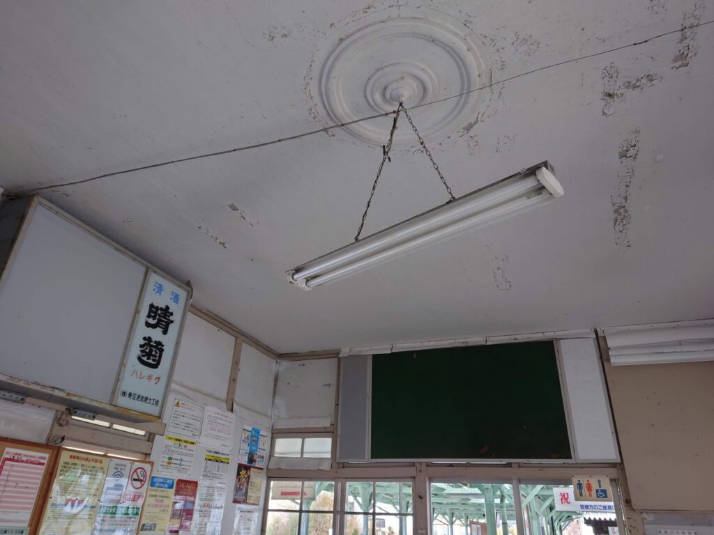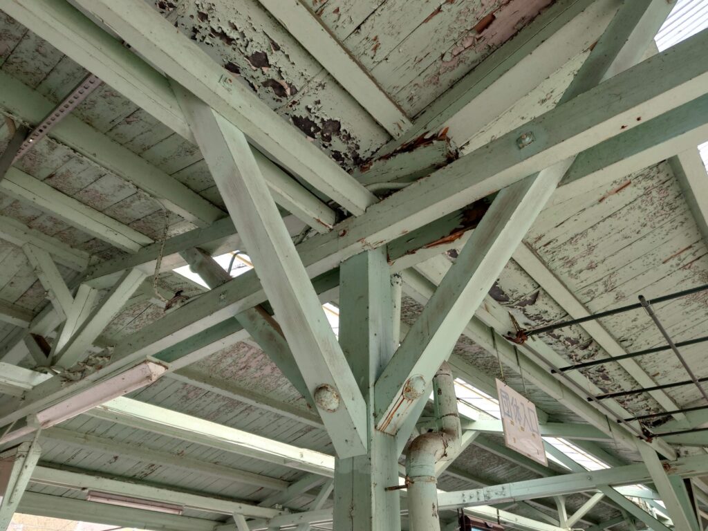 木造トラス構造です。ボルトやナットで補強されています。洋小屋(よごや)と呼ばれる建築と思います。間違えてたらすみません。少ない柱で広く屋根を支えることができる建築です。この建築は日本で駅舎だけではなく、学校や体育館、倉庫など広くスペースを必要とする建物に多く使われていたと思います。しっかりした建築はずっと残していけるものですね。