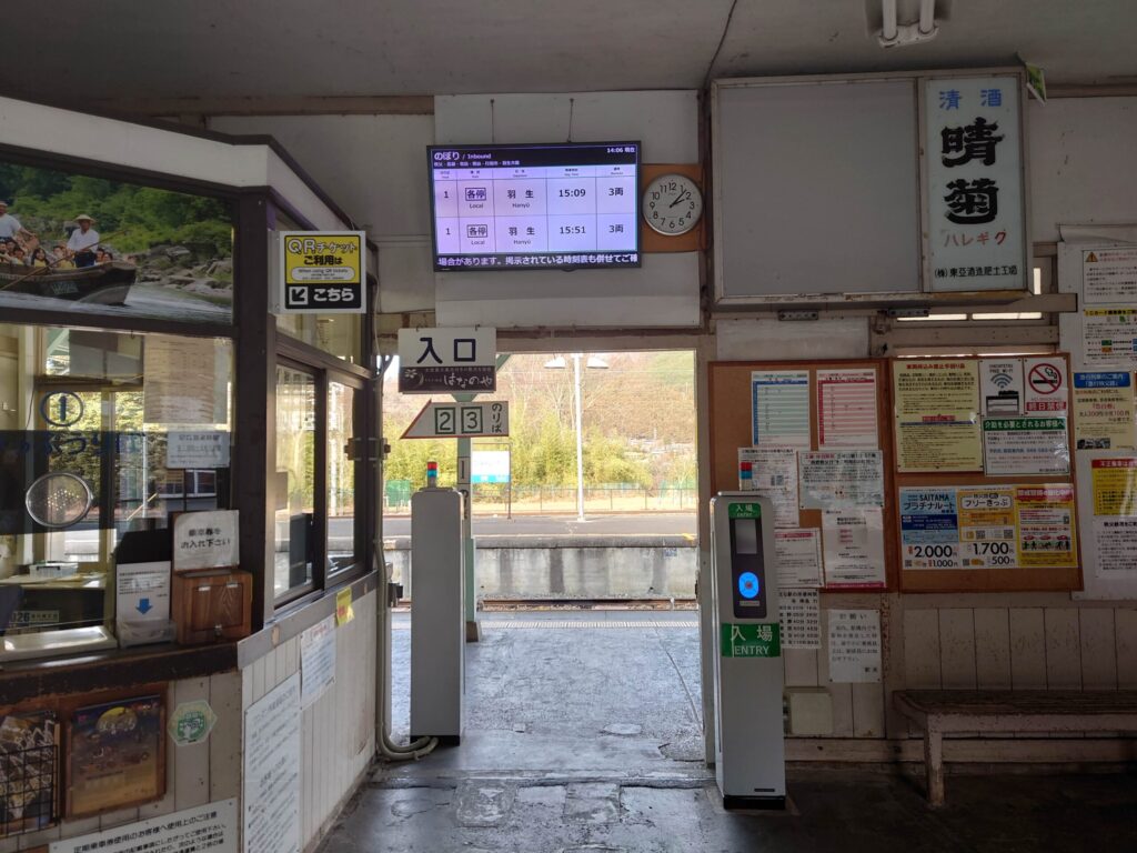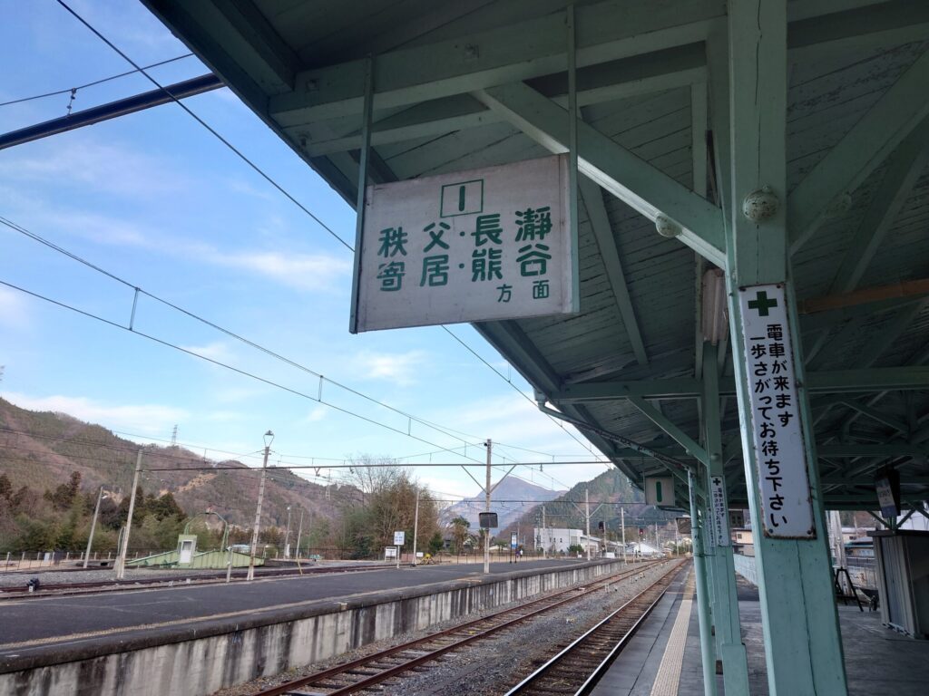 そろそろ時間になりました、改札内です。駅名、行き先案内板が木製です。縦長の注意喚起はホーローです。秩父、長瀞、寄居、熊谷方面。フォントが可愛いです。