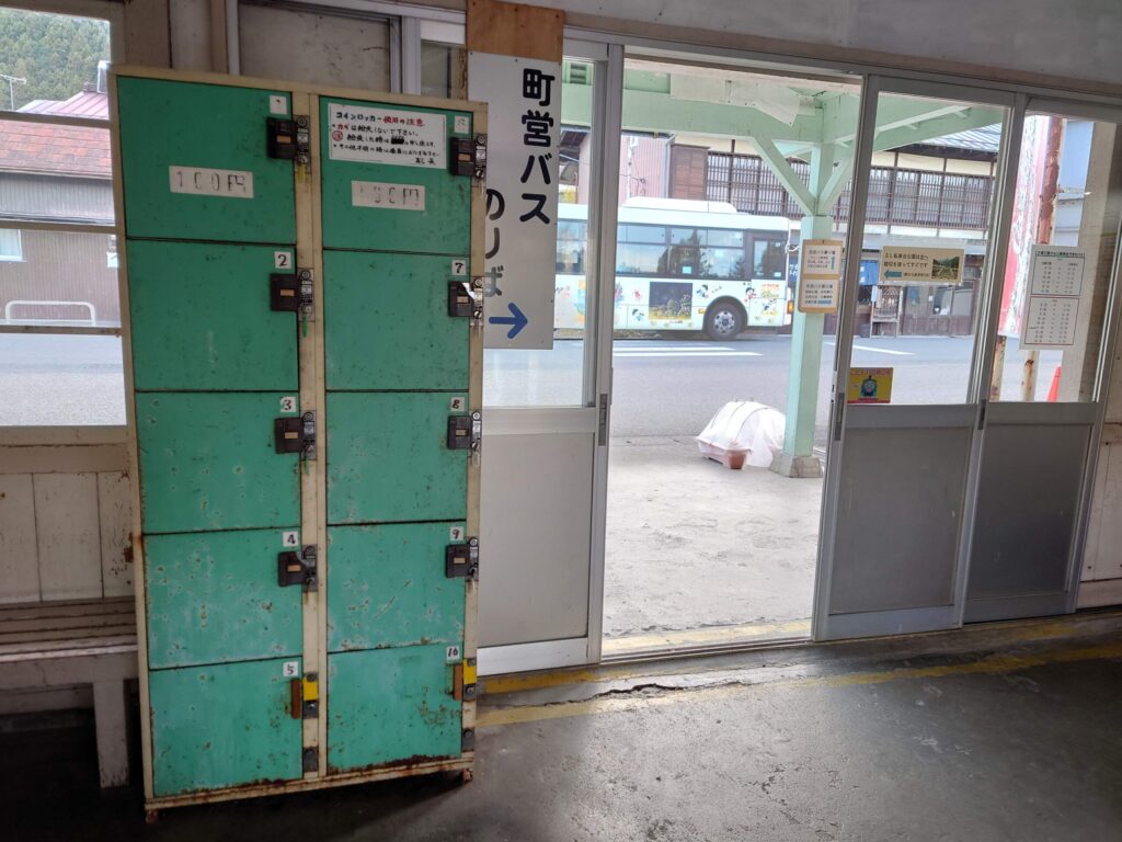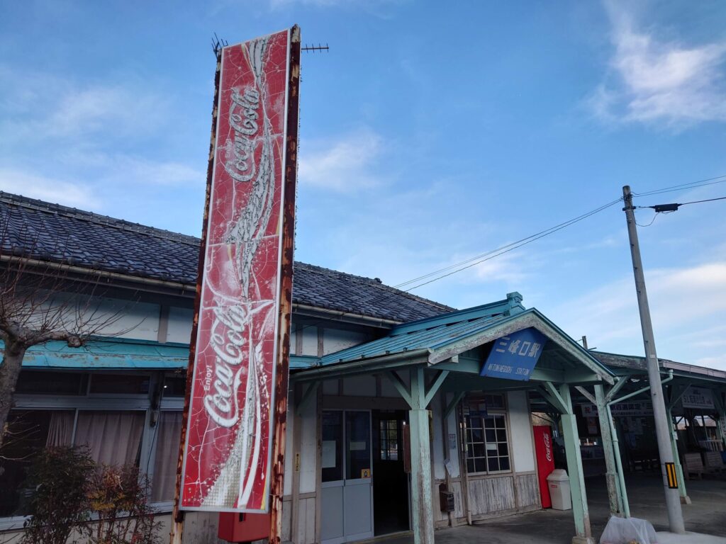 左右斜めからです。良いです。駅舎も素晴らしいですが、何とも言えないコカ・コーラの看板です。神域の玄関にある魔除け、清浄の赤い剣のように思えてきました。錆びて塗装の浮いた、時間の重みを感じさせる佇まいが駅舎と良いバランスです。